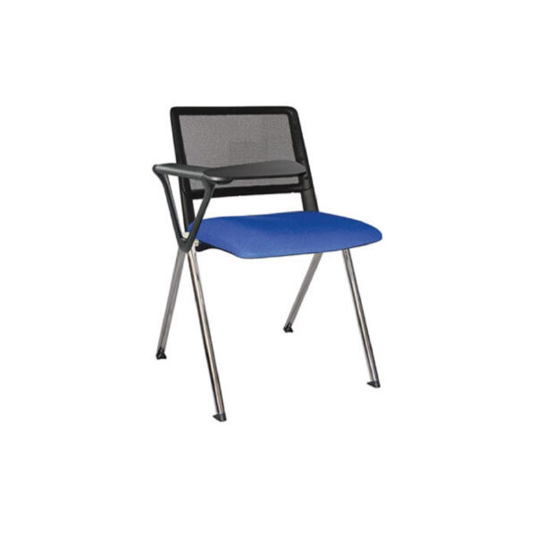Pupitre de capacitación con asiento acojinado y tapizado en tela respaldo de en tela mesh, paleta abatible en color negro. Base tubular cromada , ngo.