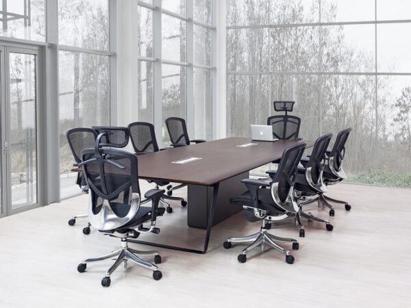 • Mesas de juntas rectangulares con cubierta en chapa de madera de nogal de 40mm de espesor.