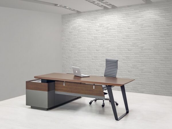 - Escritorios con cubierta en chapa de madera de nogal de 25mm de espesor.