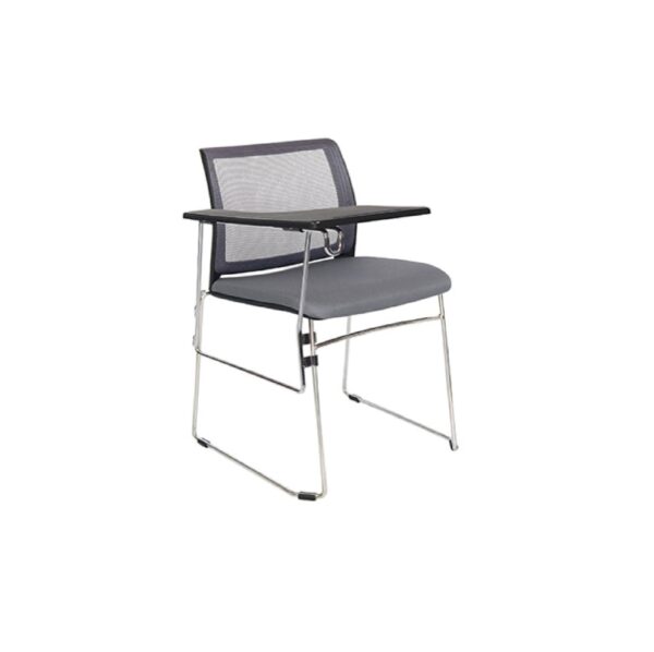 Pupitre de capacitación con asiento scojinado y tapizado en tela y respaldo tapizado en tela mesh paleta abatible en color negro. Base tubular cromada.