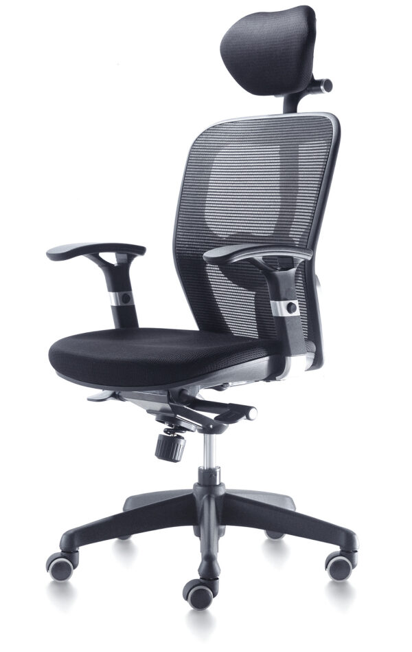 SILLA DIRECTIVA CON ASIENTO DE ESPUMA Y TAPIZADO EN TELA NEGRO Y RESPALDO  TAPIZADO EN TELA MESH EN COLOR NEGRO, ACOJINAMIENTO EN APOYO LUMBAR  Y AJUSTE DE POSICION .