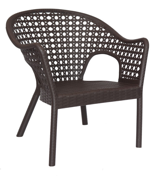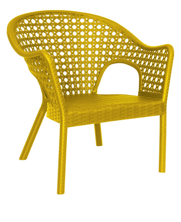 - Patas, asiento y respaldo terminado en imitación mimbre de una sola pieza en polipropileno de alta resistencia y duración para intemperie, resistente a los rayos ultravioleta.