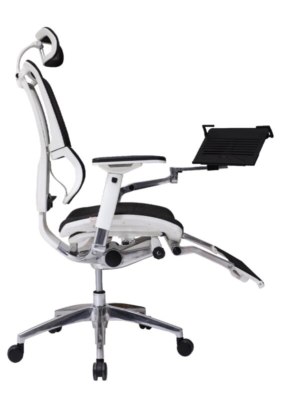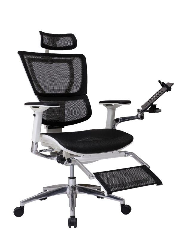 Fijo al asiento por estructura en aluminio terminado en color blanco, tapizado en malla 100%